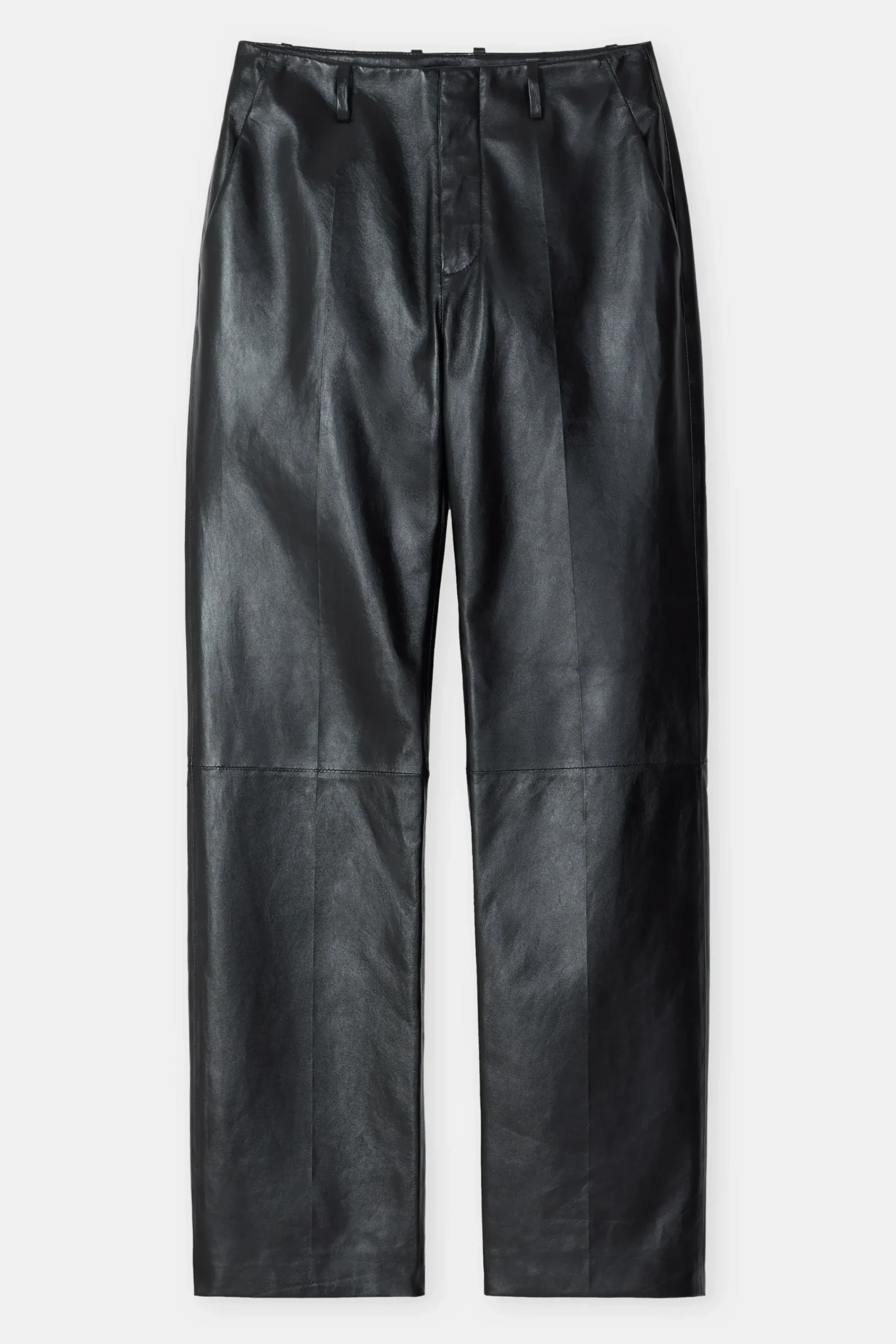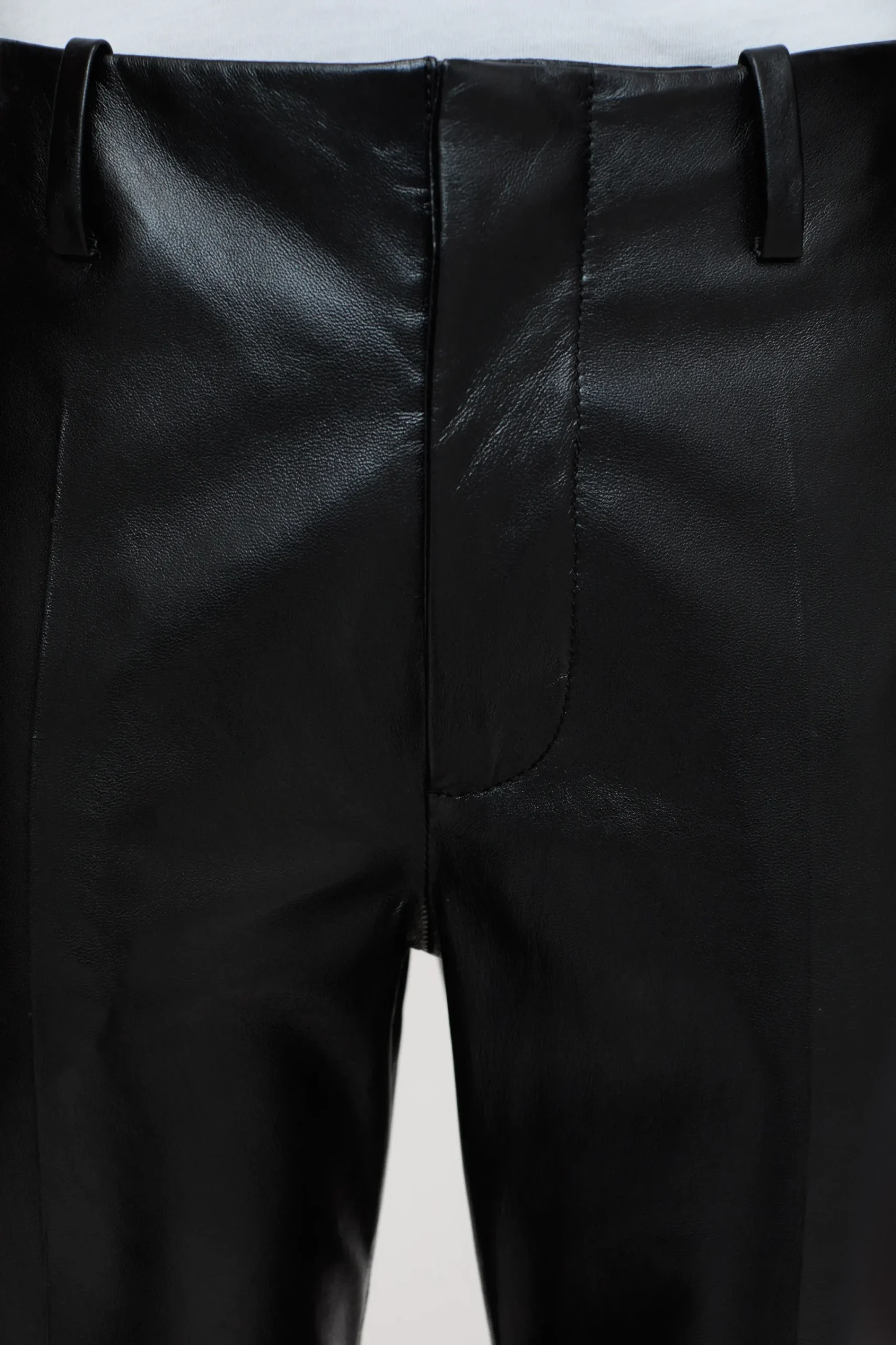Unser neues Hosenmodell ist aus feinstem, schwarzem Lammleder mit papierähnlicher Haptik und leicht glänzender Oberf…