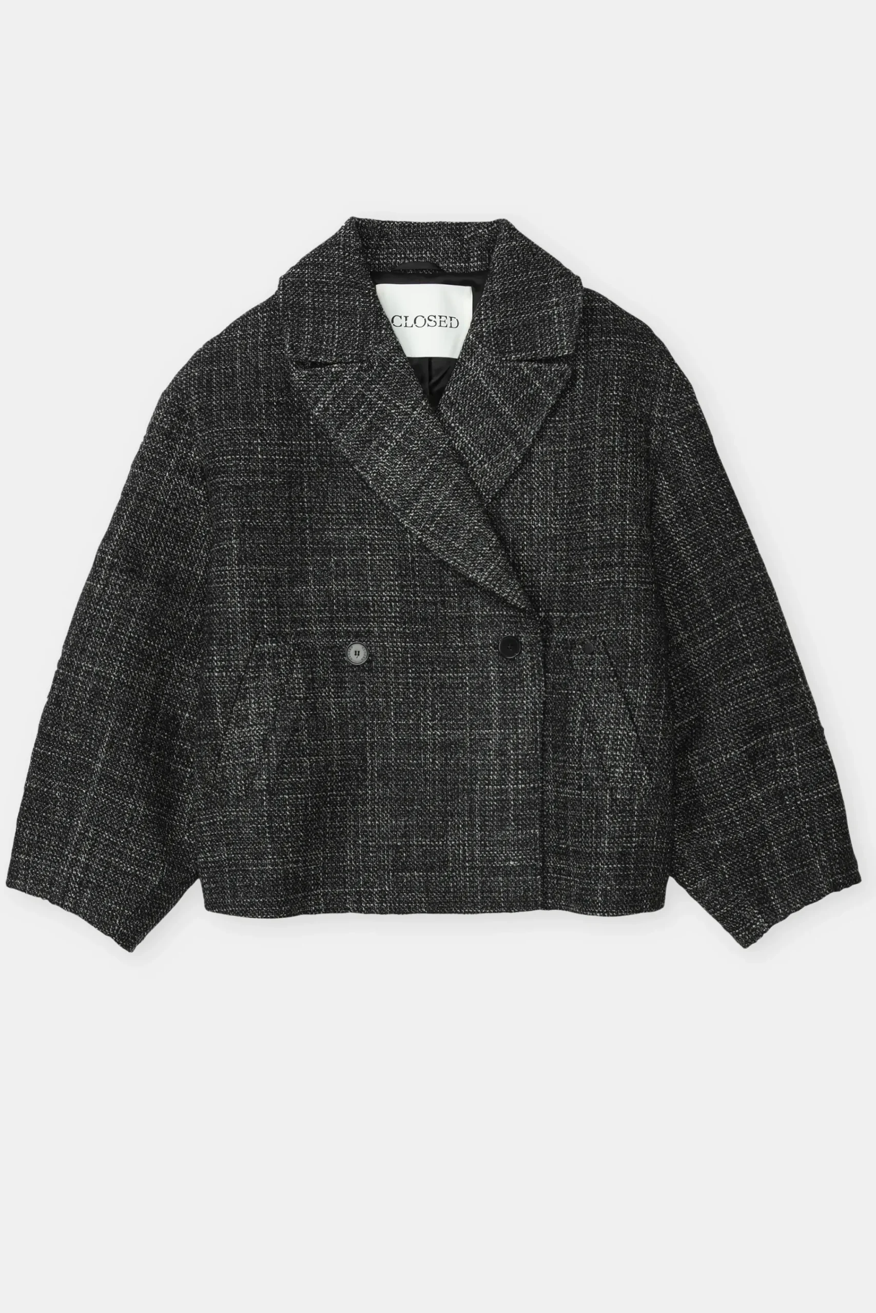 In moderner Oversized-A-Linie aus kompaktem Herringbone-Tweed: Jacke mit Reverskragen, Hornknöpfen, schrägen Taschen…