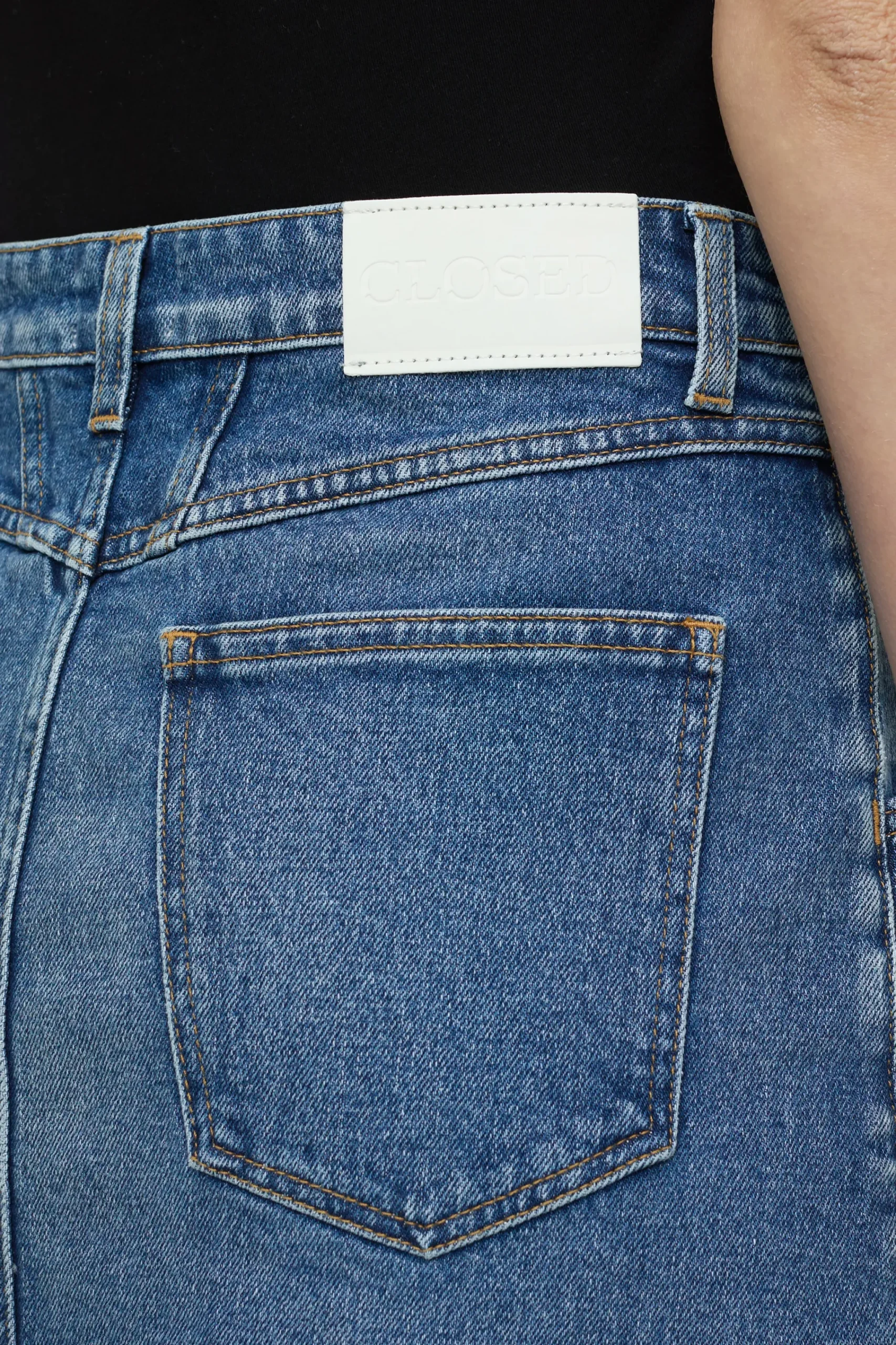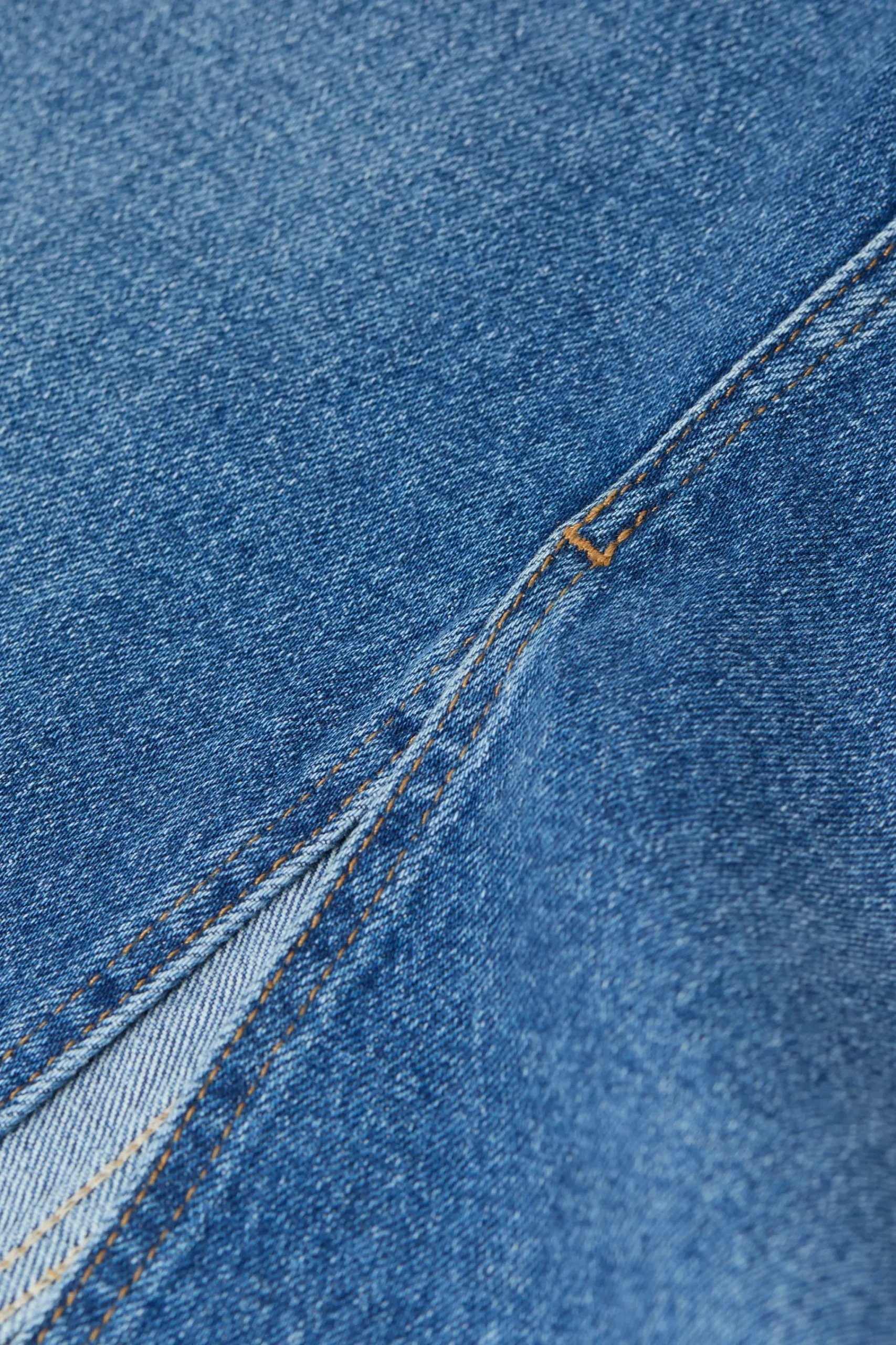 Aus kräftigem Gentle Comfort Stretch Denim (12 oz.) in Worn-Waschung: Unser Midirock in A-Linie mit authentischer Twi…