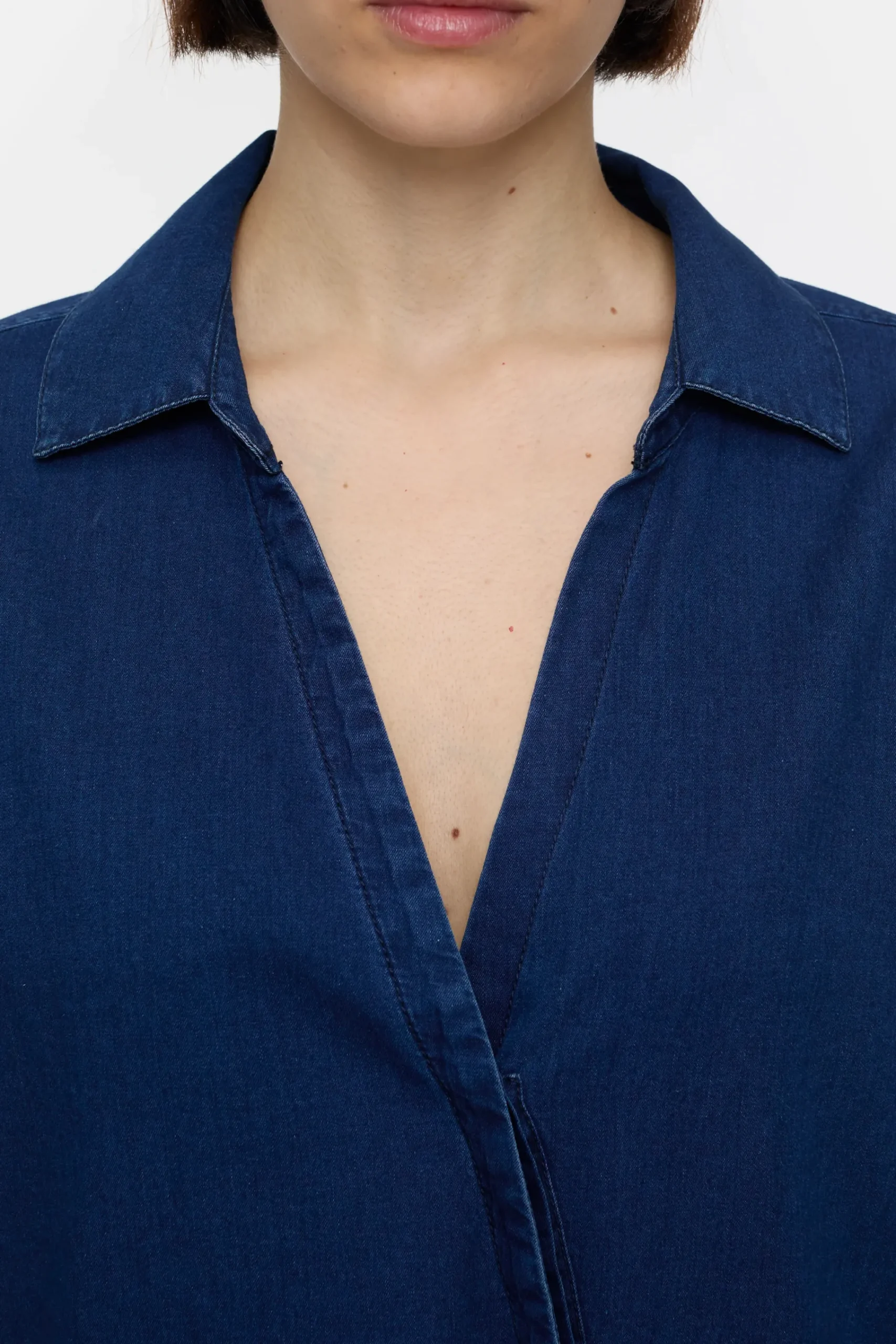 Aus reiner Baumwolle in spanischer und luftiger Denim-Qualität gefertigt: Unsere asymmetrisch designte Bluse mit Krag…