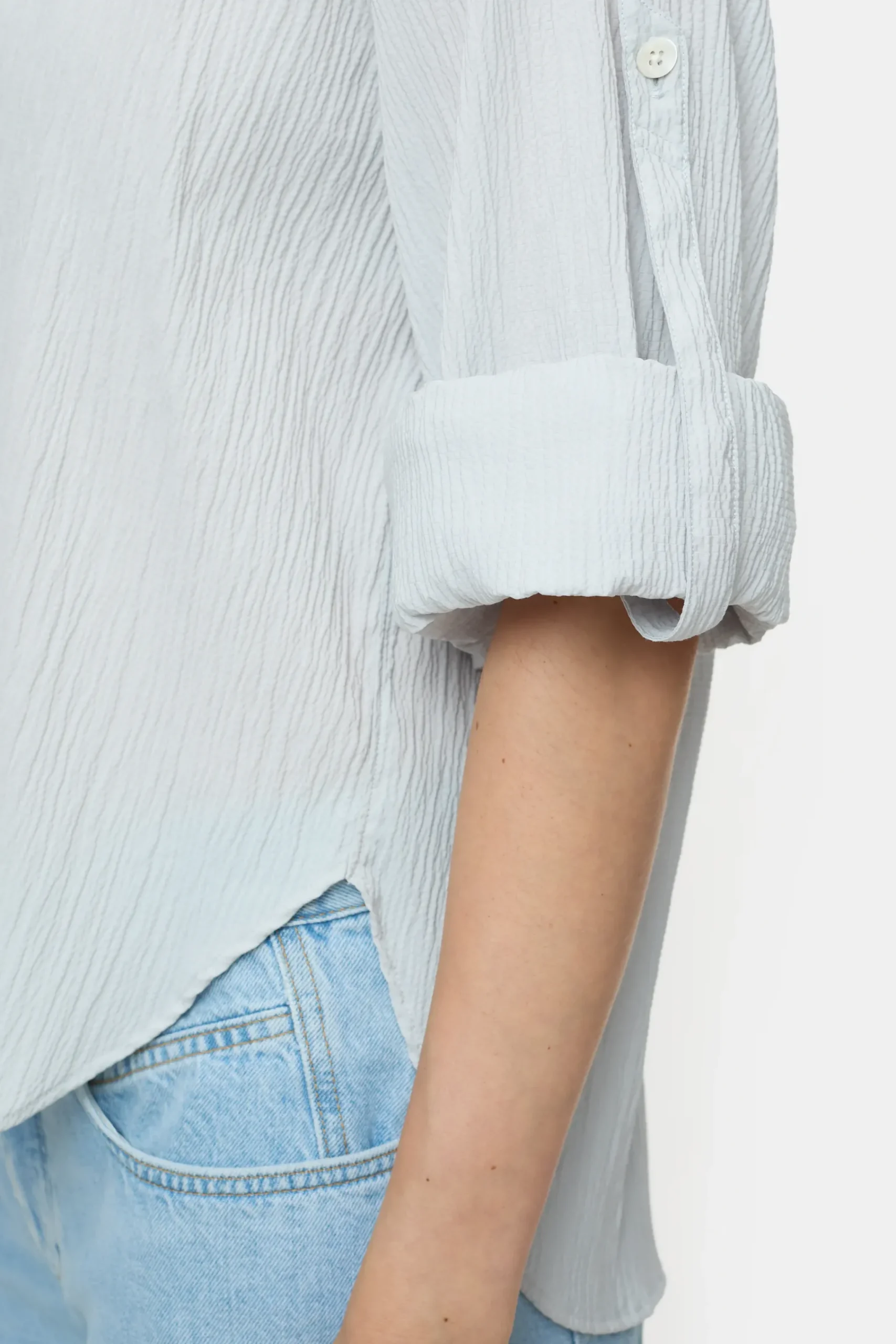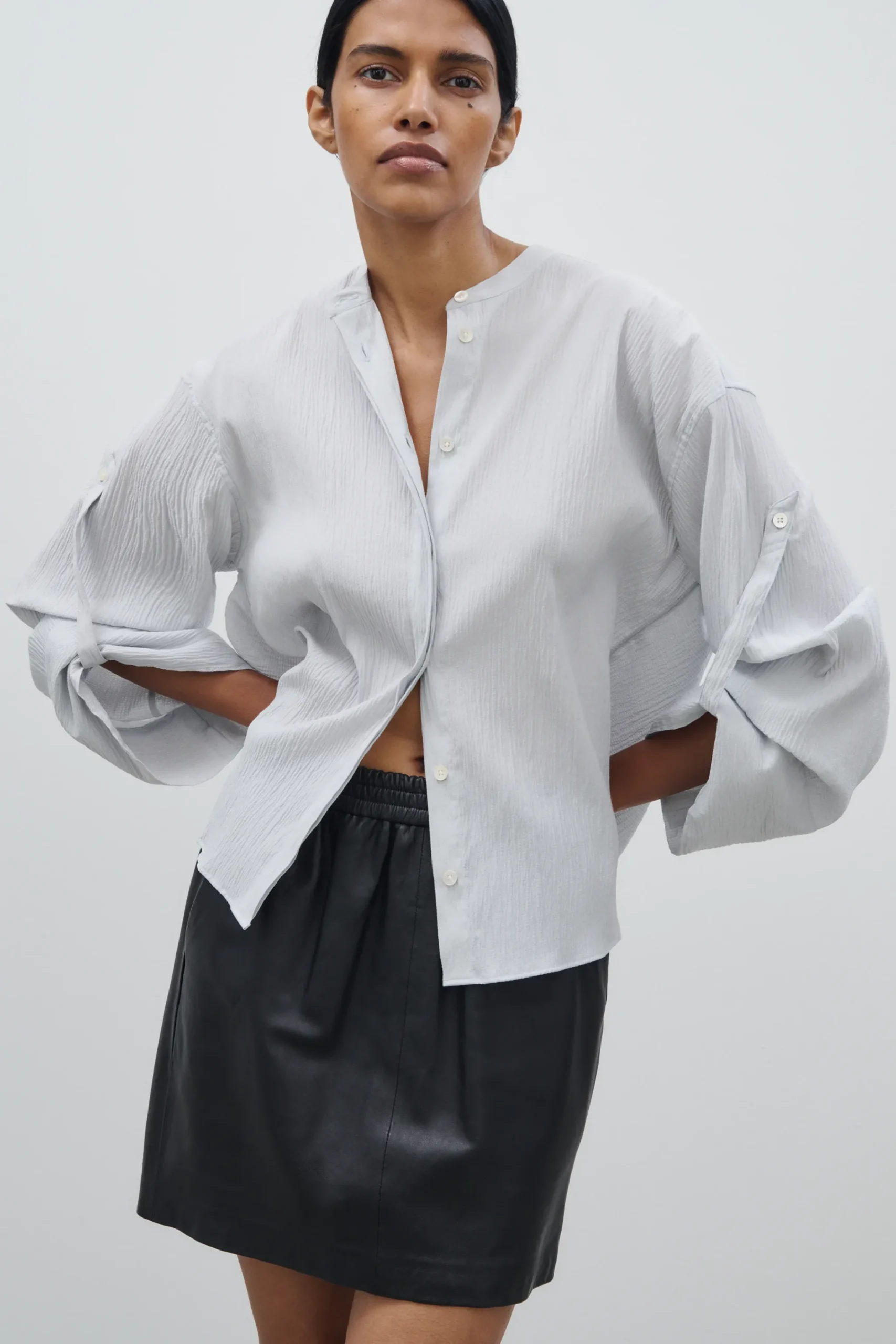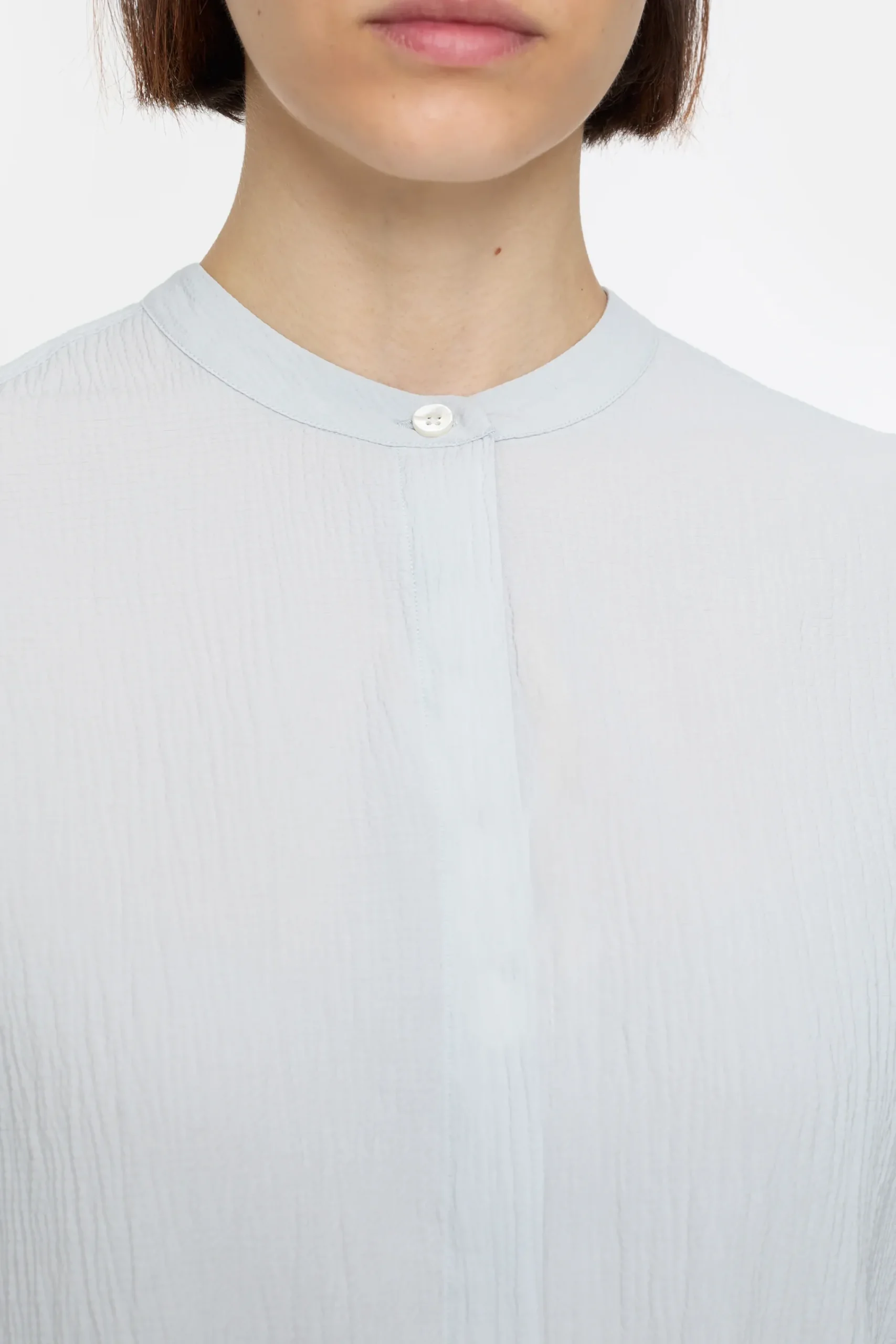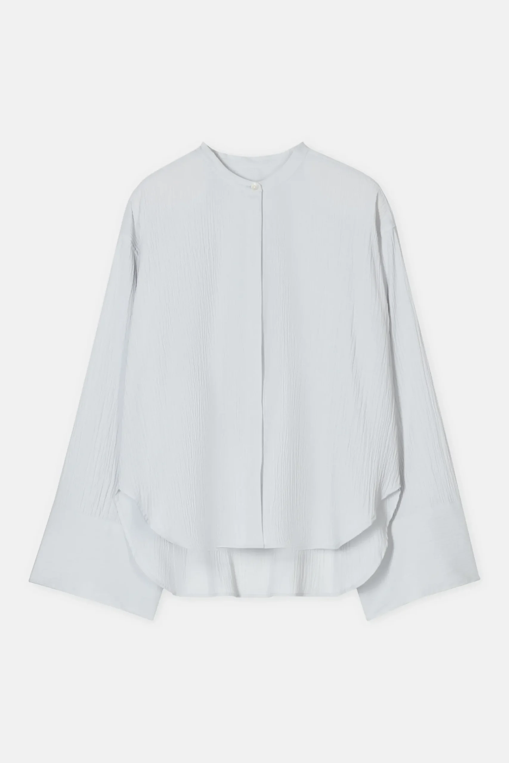 Unsere Bluse im Relaxed Fit mit Stehkragen, weiten Ärmeln, Perlmuttknöpfen und abgerundetem Saumabschluss. Durch Tur…