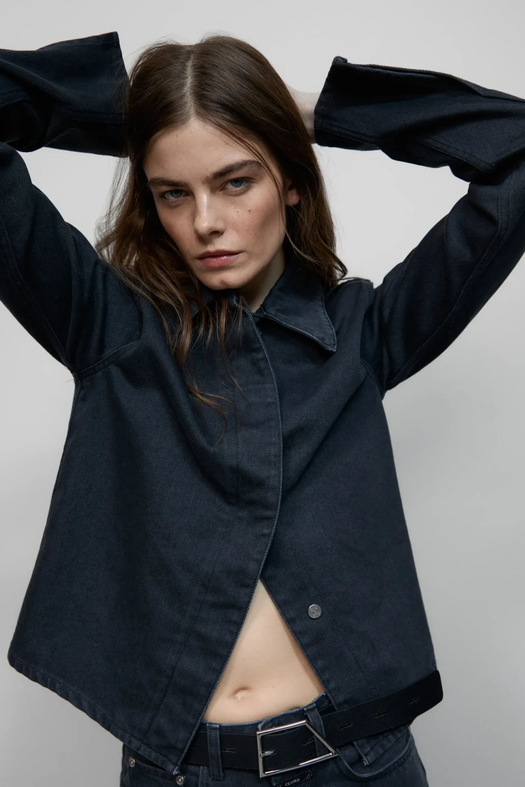 Teil unserer Eco-Denim-Linie A BETTER BLUE: das taillierte und kurze Overshirt aus kräftigem Denim (13 oz.) in schwar…