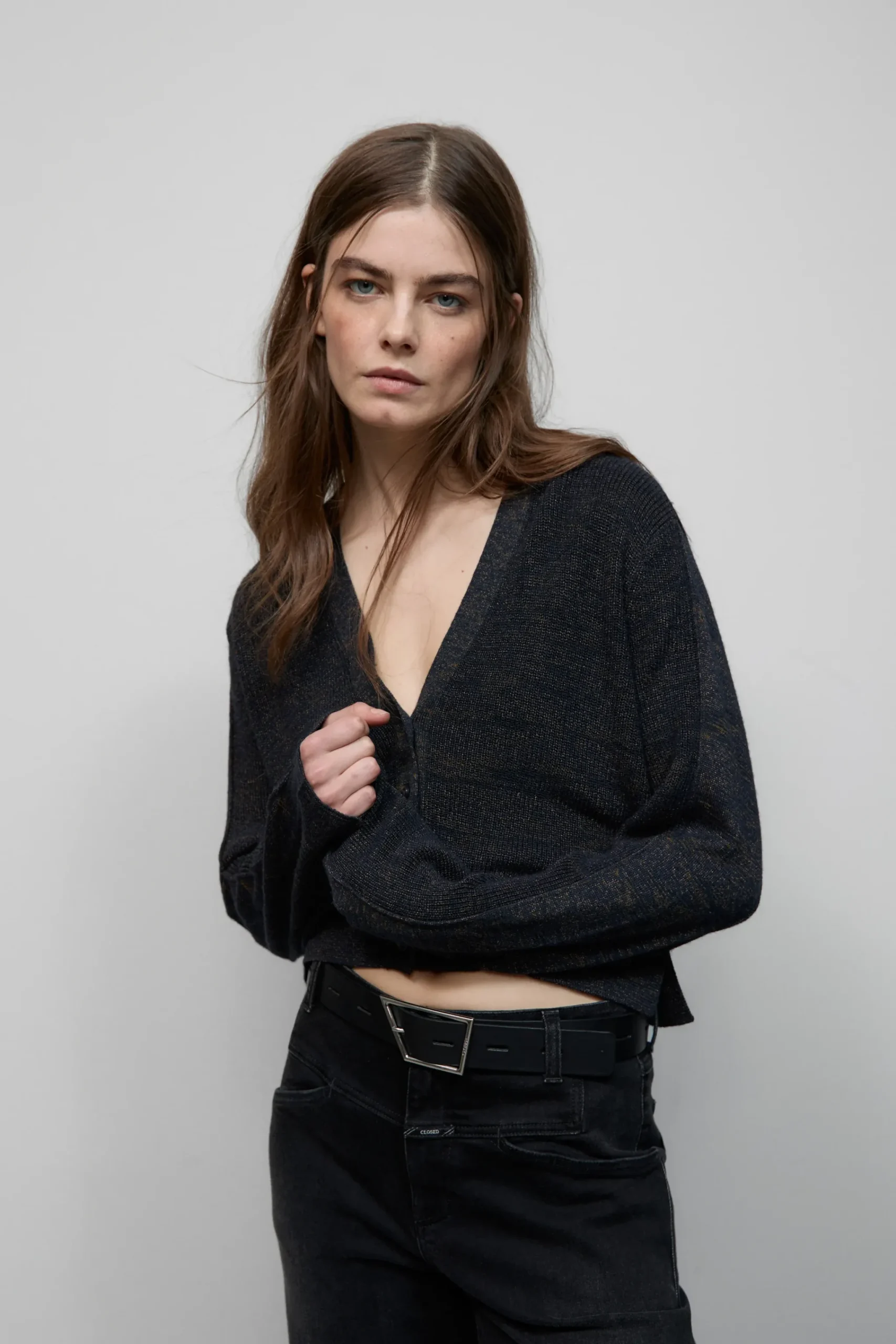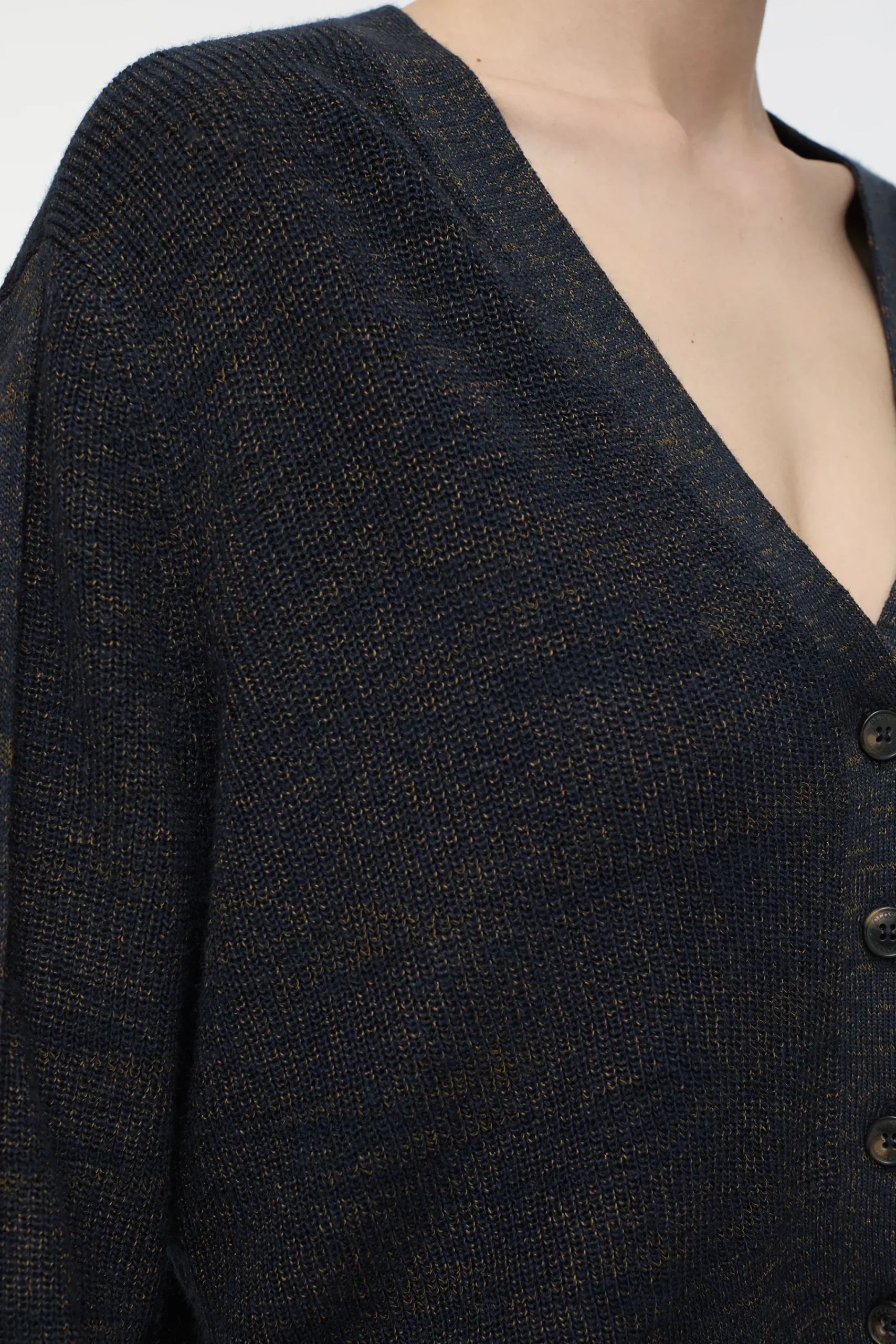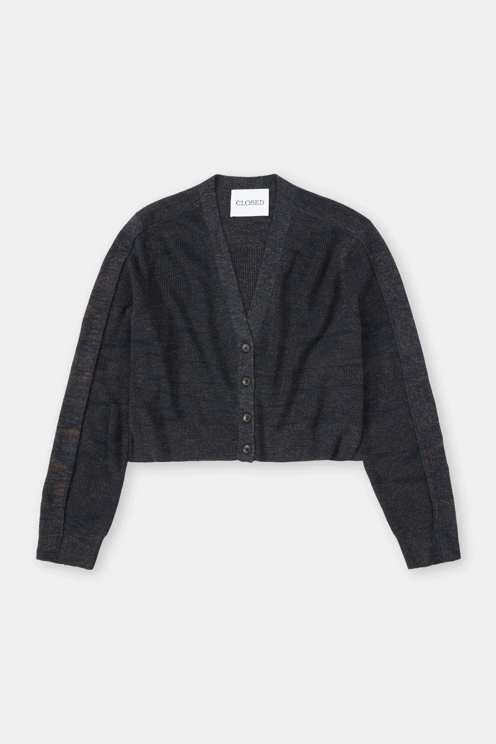 Italienisches Garn (12 gg) im melierten Feinstrick: Unser kurzer Cardigan vereint weiche Merinowolle und subtil glänz…