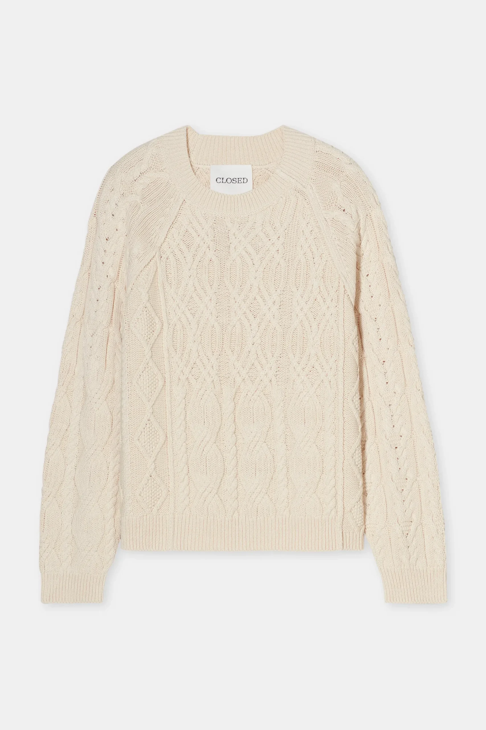 Ketten- und Zopfstrukturen im mittelschweren Strick (5 gg unterstreichen den sanft ausgewaschenen Farbton unseres Pull…