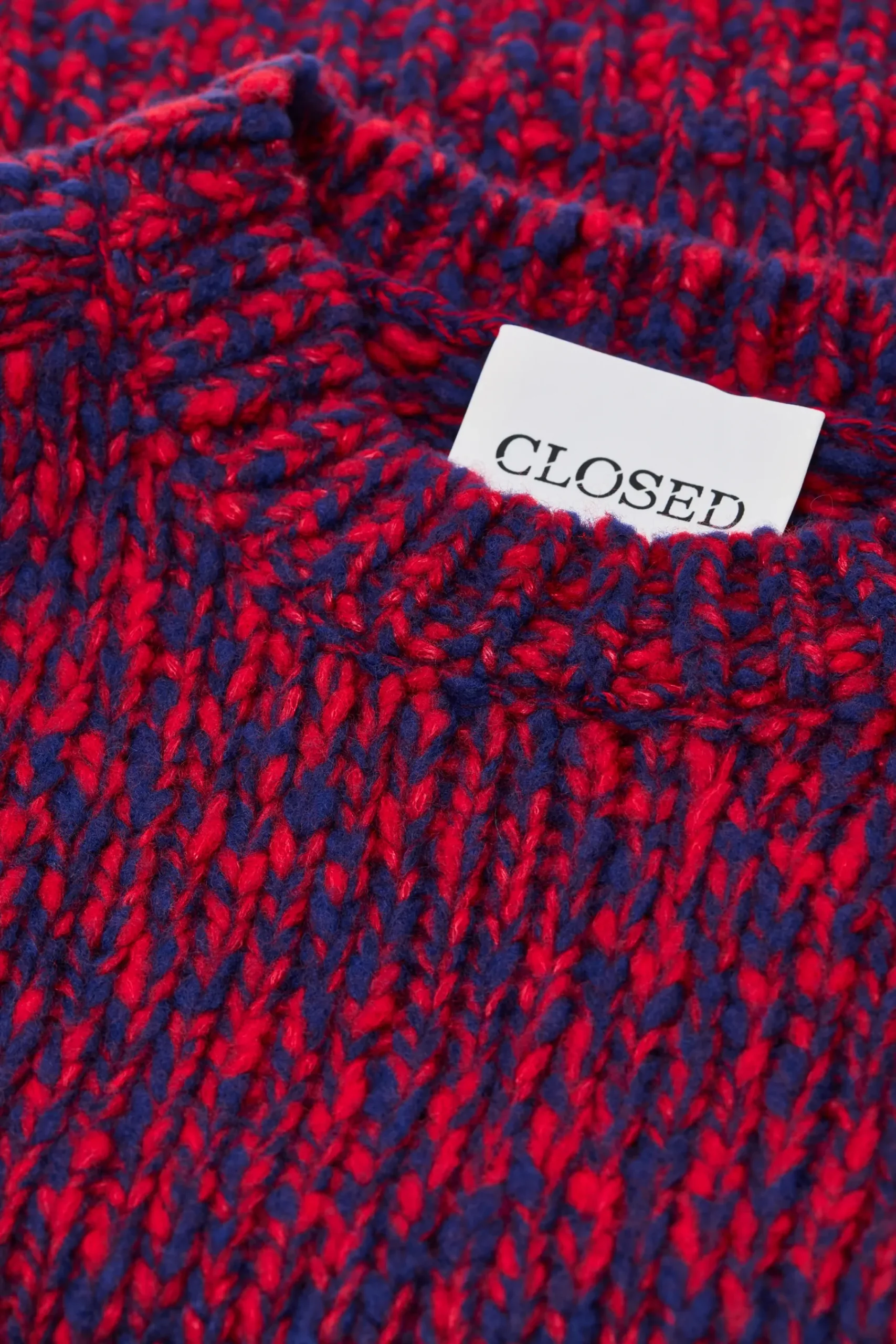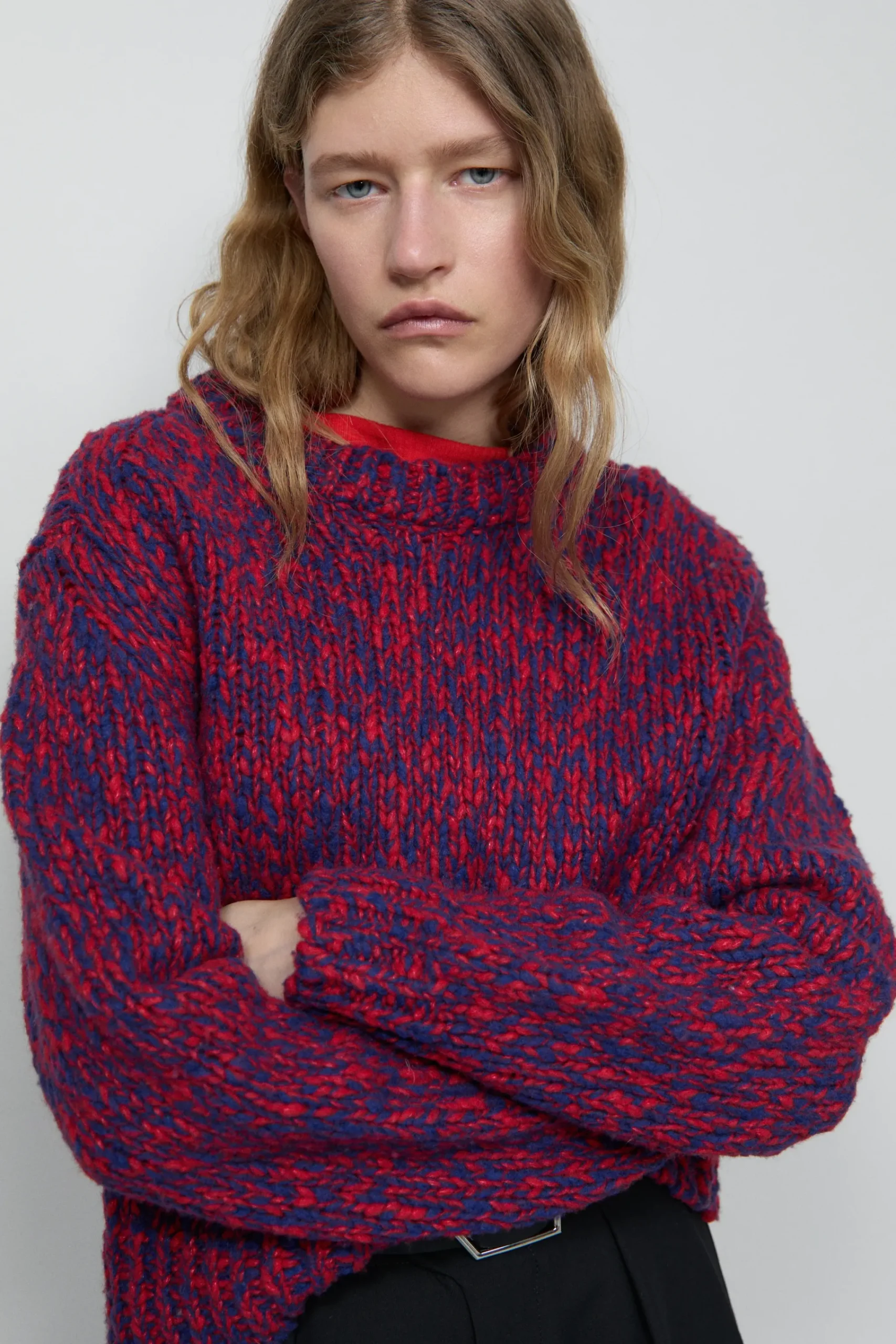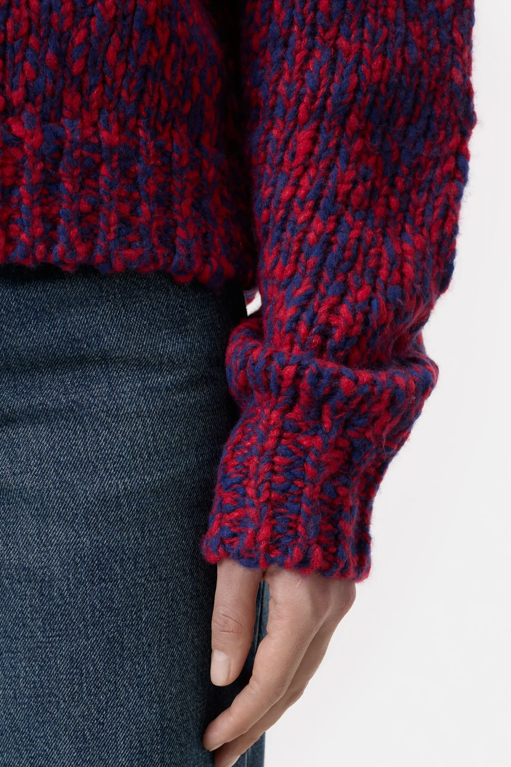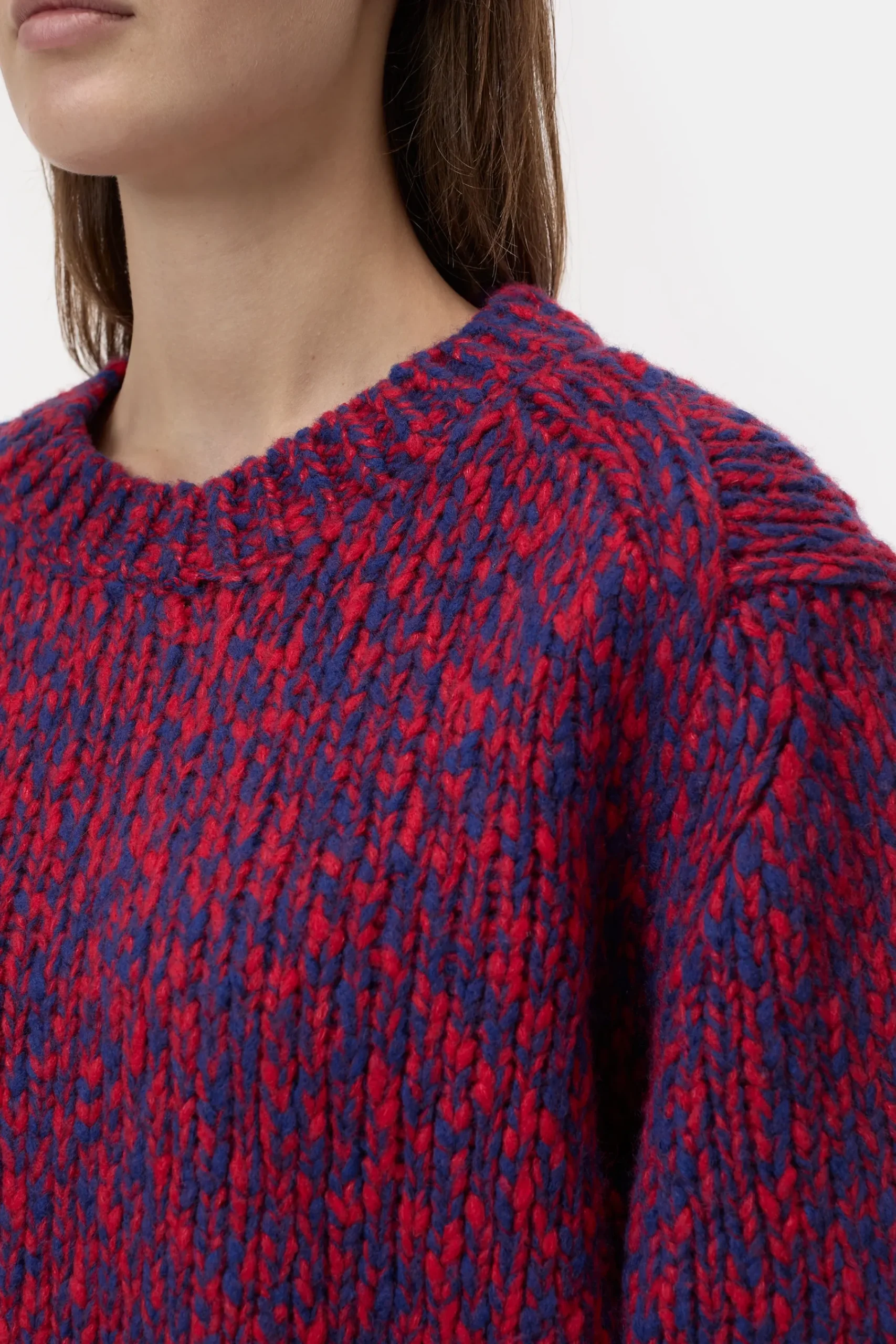 Dieser Rundhalspullover ist aus blau-rotem Grobstrick (1,5 gg) in Mouliné-Optik gefertigt. In verkürzter Länge mit …