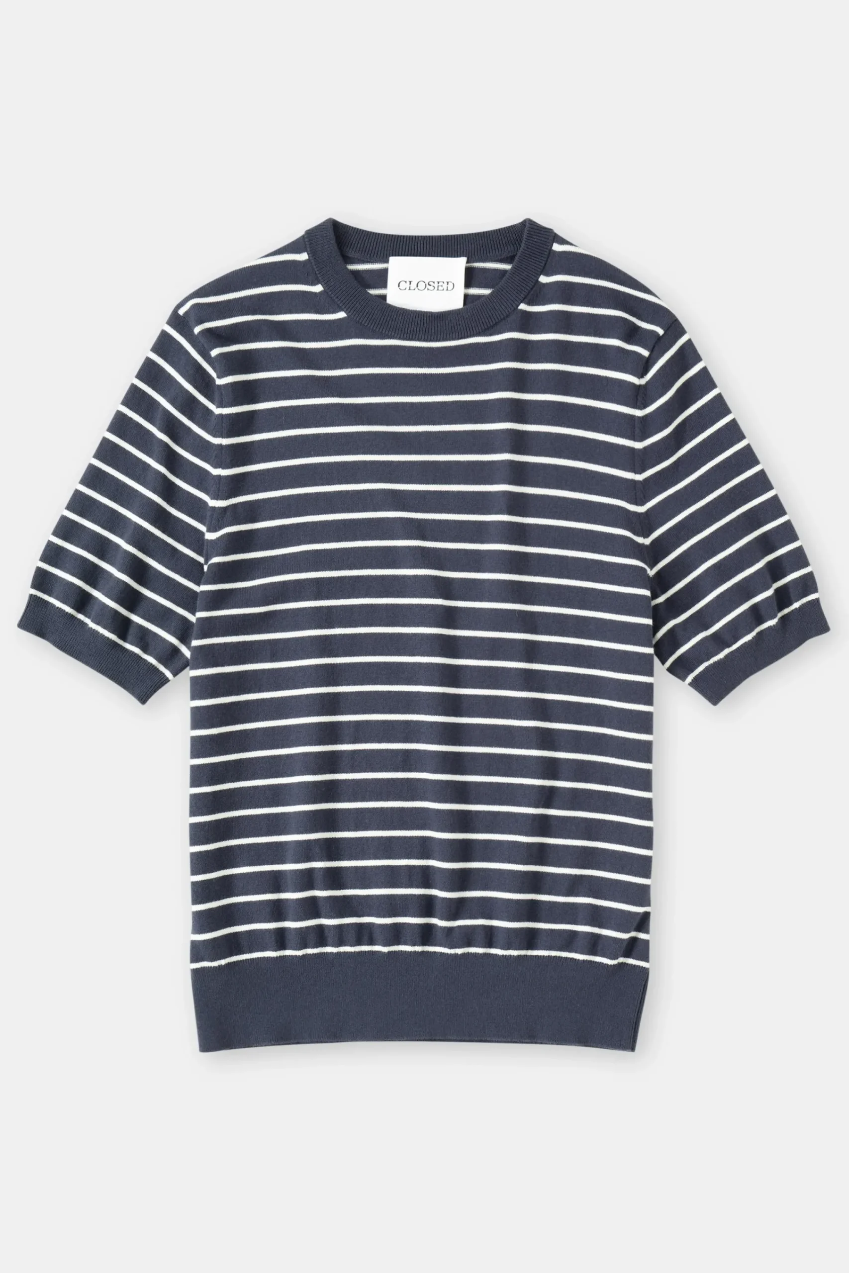 Feinstrick (14 gg) mit Kurzarm, gerippten Bündchen am Rundhalsausschnitt sowie Rippbündchen am Ärmel- und Saumabsch…