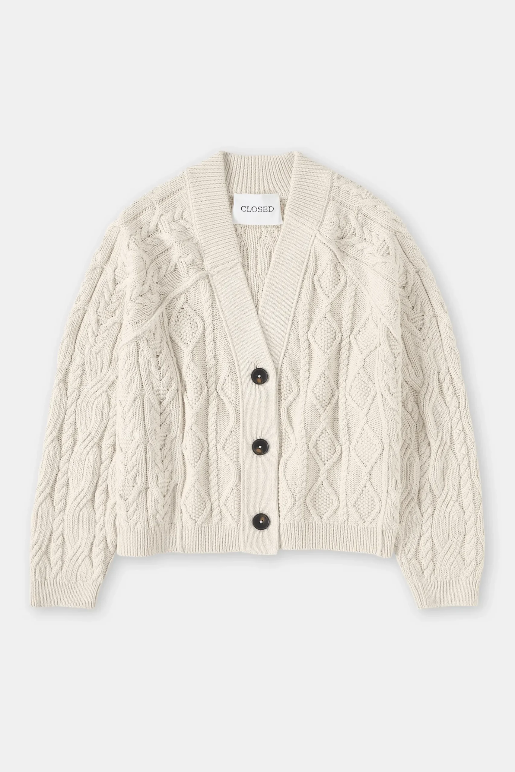 Der Cardigan mit Knöpfen in Horn-Optik ist aus reinem Bio-Baumwollgarn in unterschiedlichen Zopf- und Strick-Mustern …