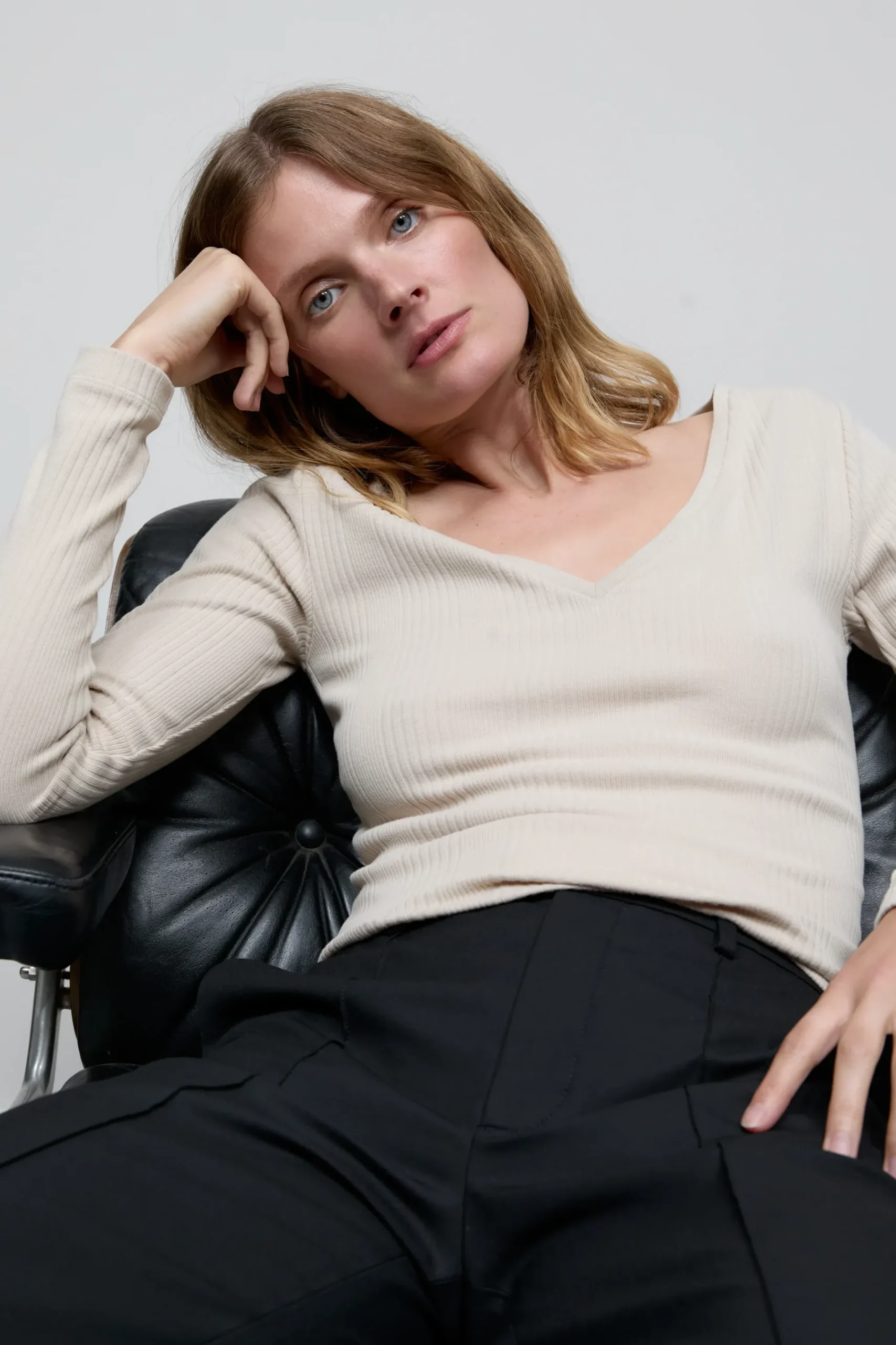 Unser Langarmshirt mit V-Ausschnitt hat eine besondere Rippstruktur und eine schmale Passform. Der weiche Baumwoll-Mix…