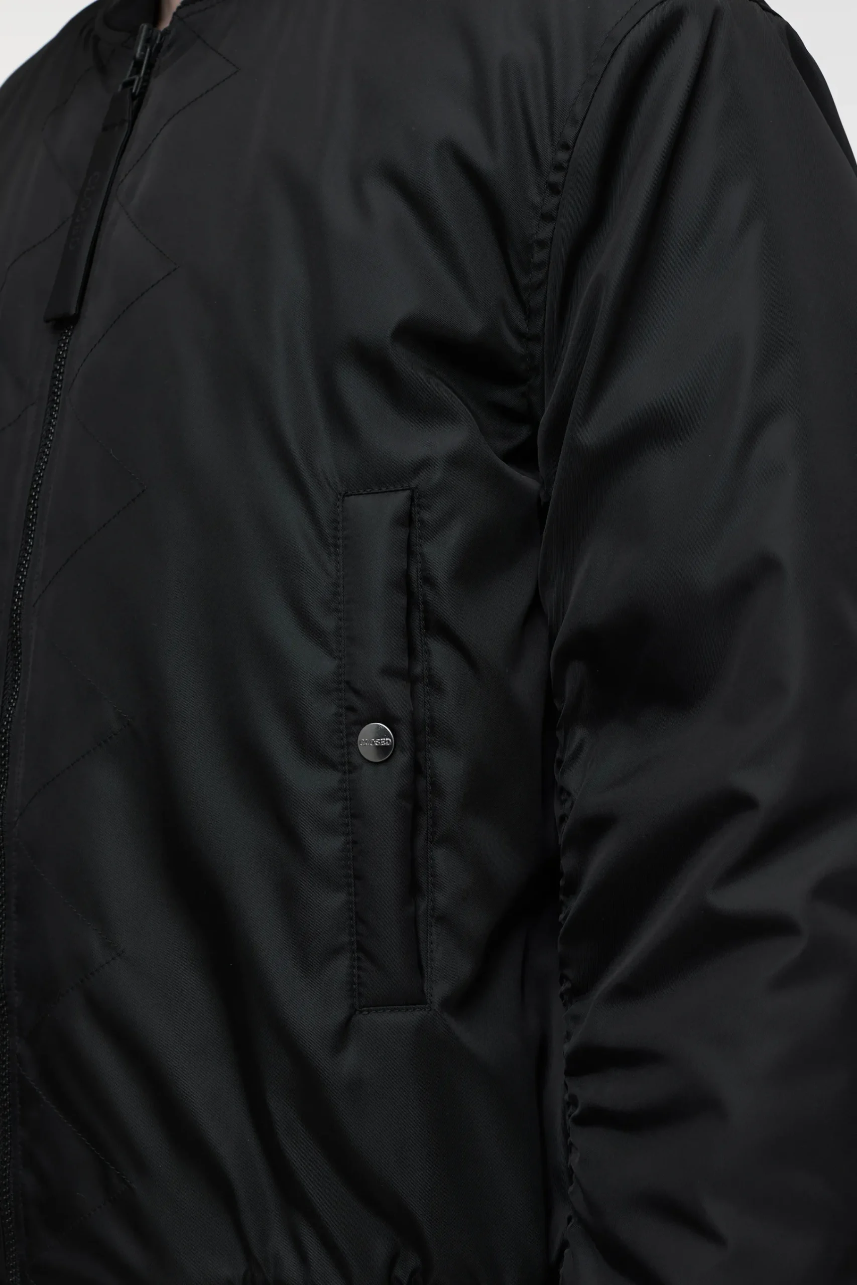 Wir haben für diese Bomberjacke einen italienischen Nylonstoff mit matter Optik und festem Griff ausgewählt. Die Jac…