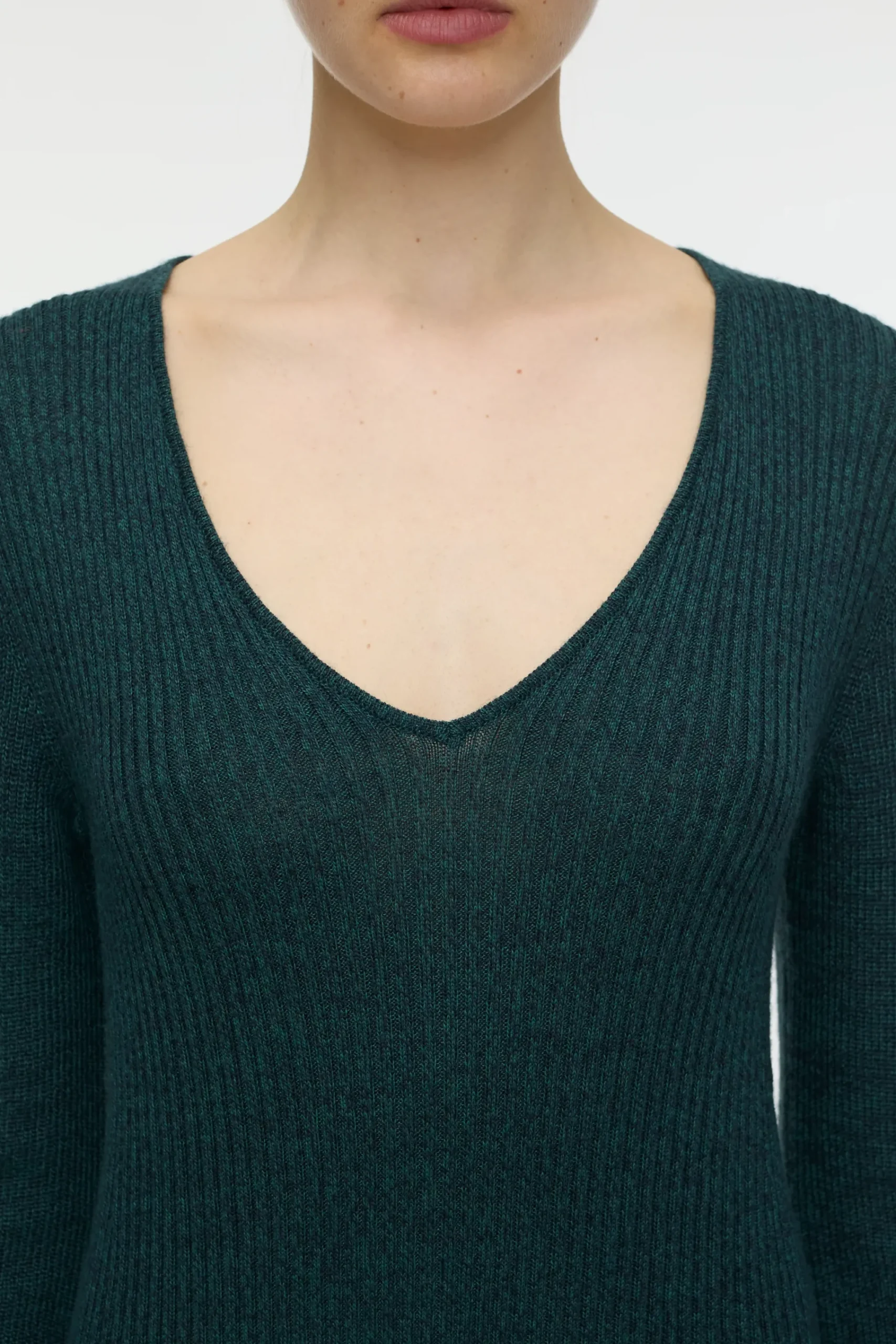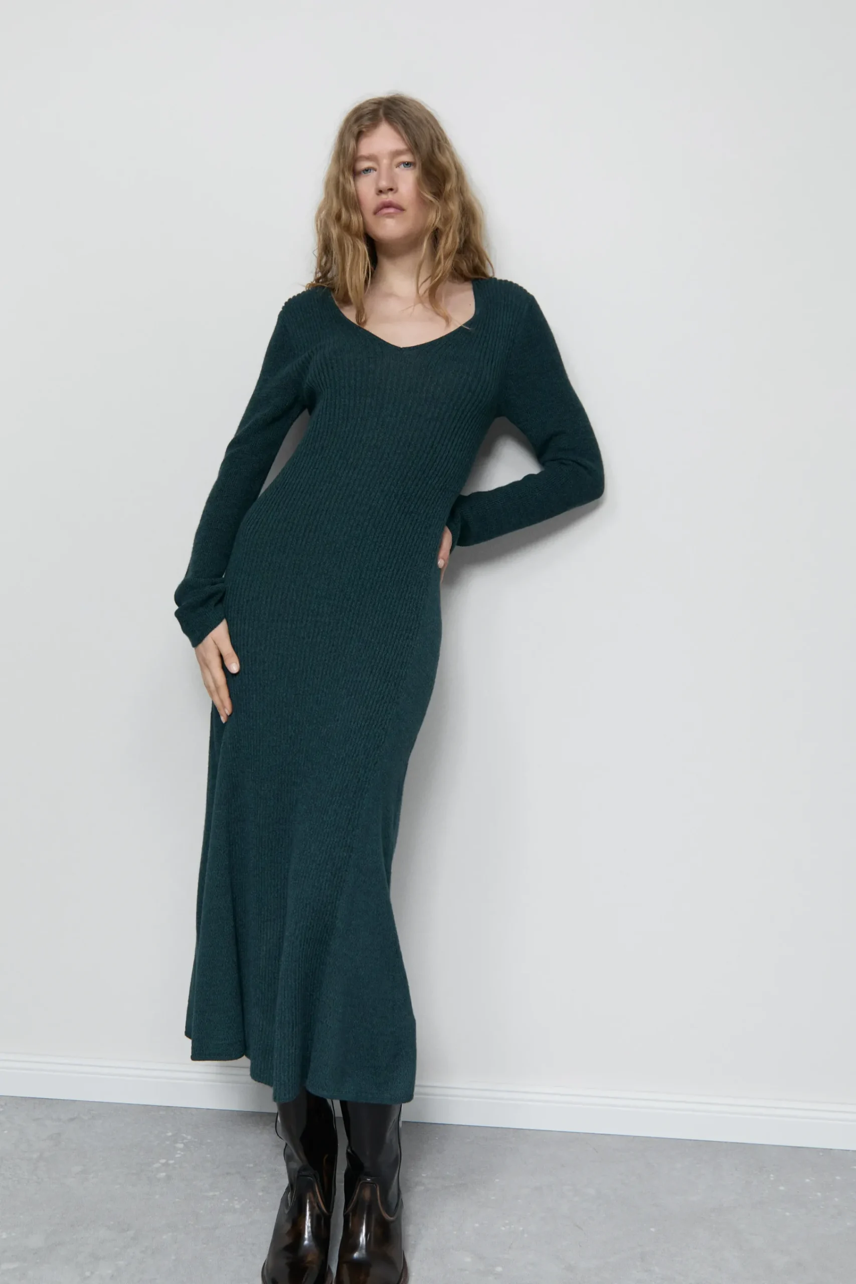 Aus italienischem Garn mit weichem Griff und Melange-Optik gestrickt: langes Kleid mit V-Ausschnitt und enganliegender…