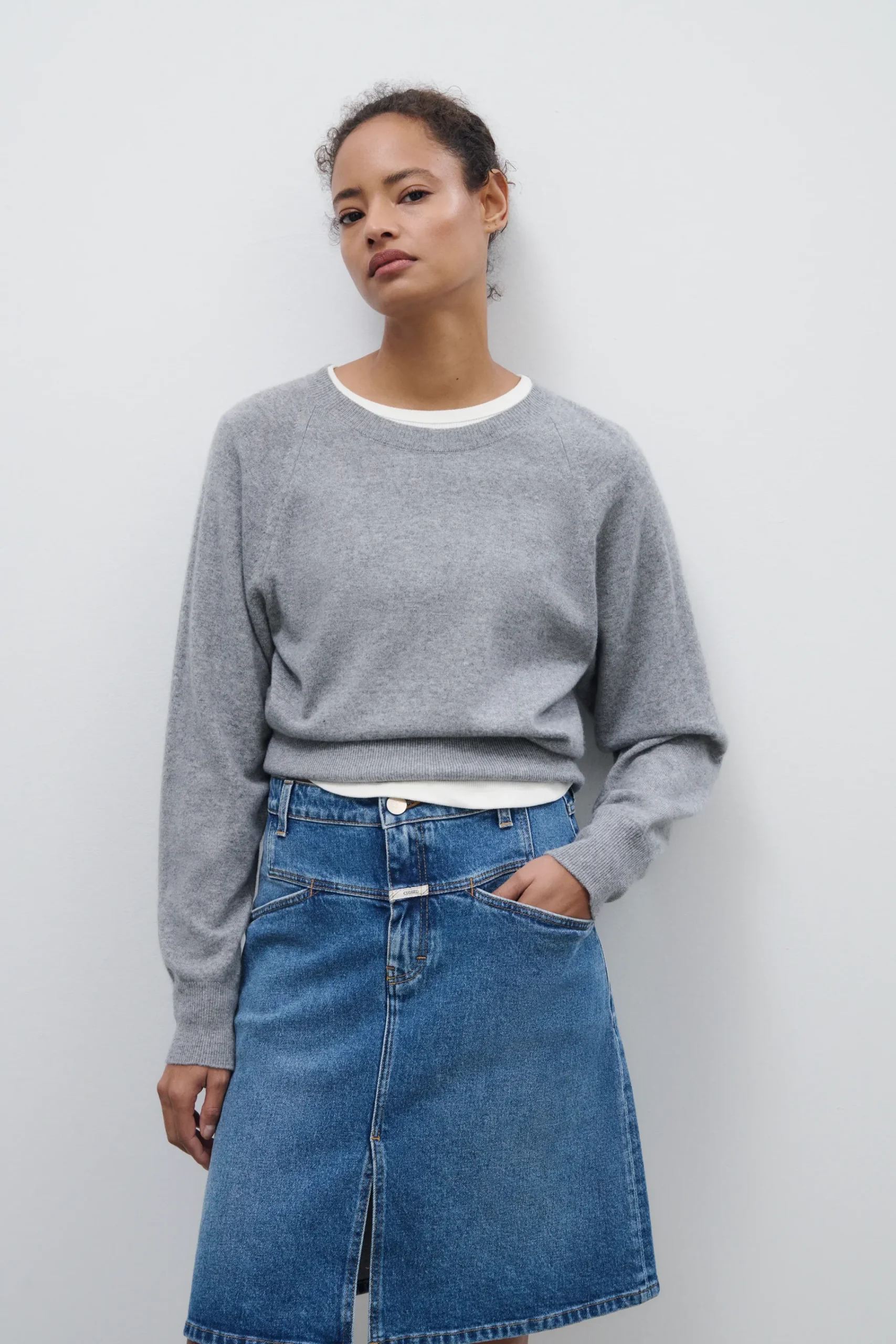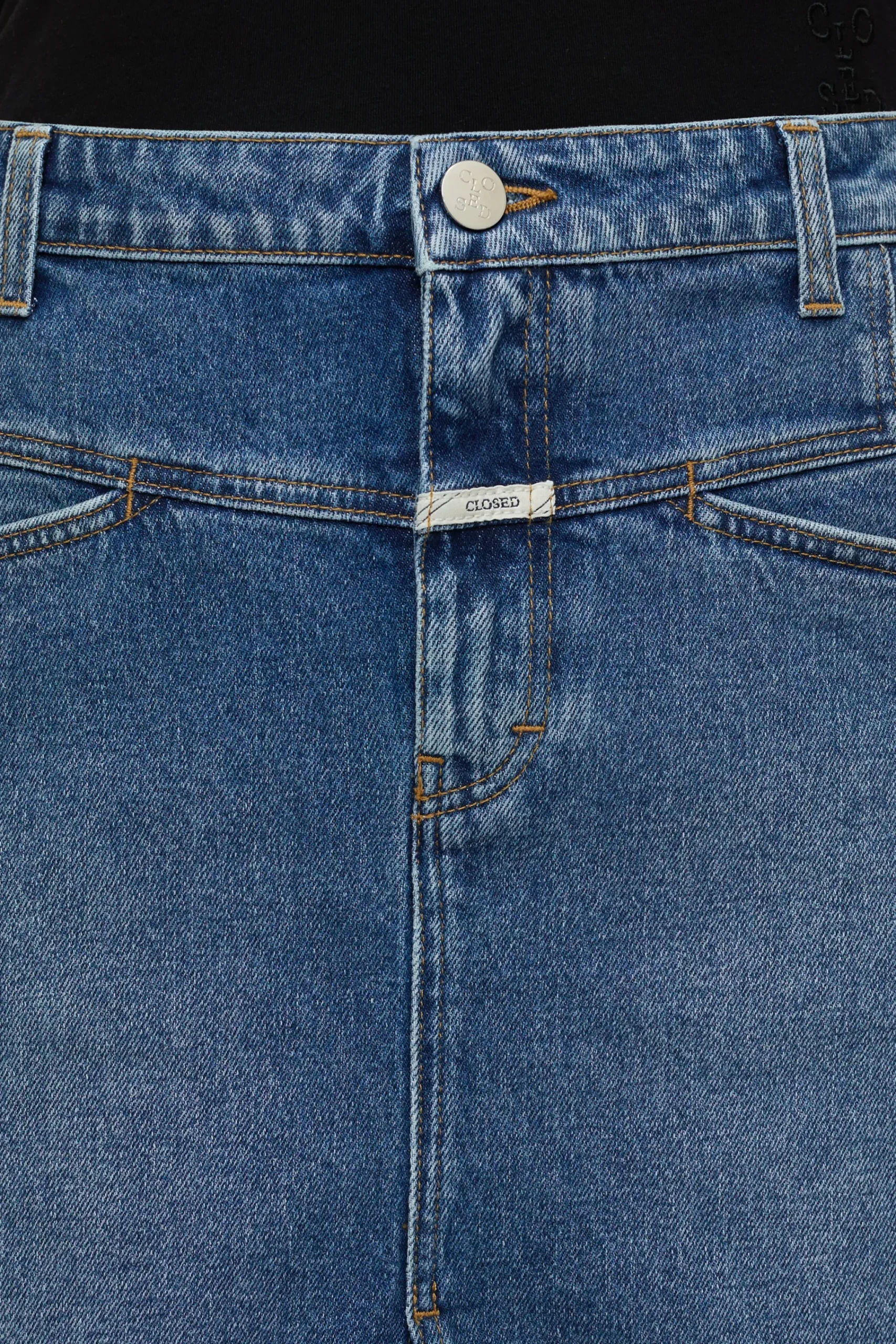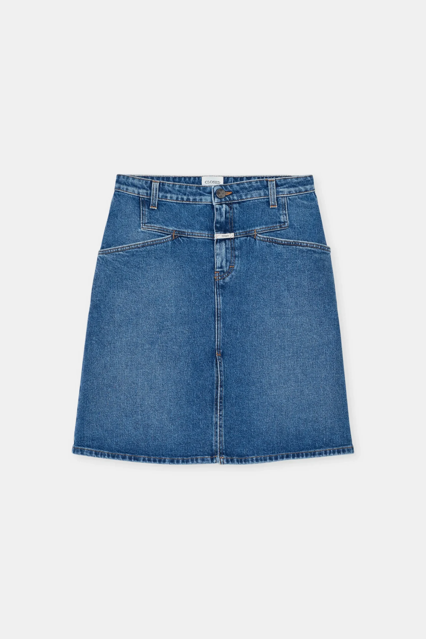 Aus kräftigem Gentle Comfort Stretch Denim (12 oz.) in Worn-Waschung: Unser Midirock in A-Linie mit authentischer Twi…