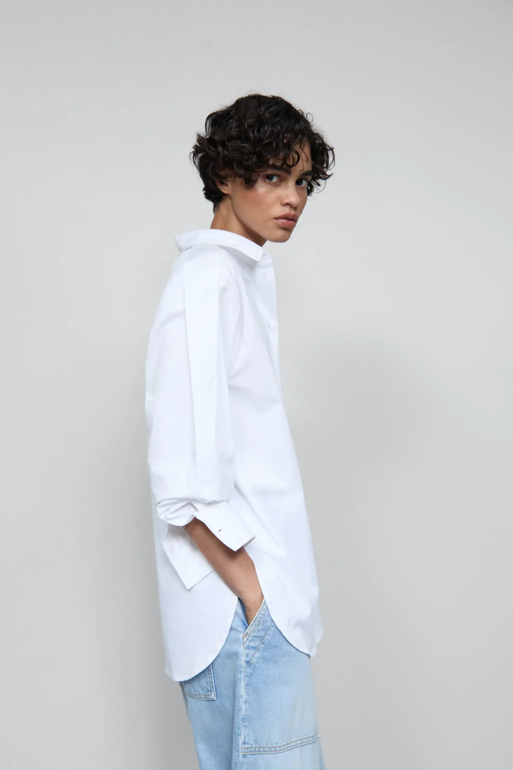 Unsere extra lange Hemdbluse aus schwerer Baumwoll-Popeline mit leichtem Elasthan-Anteil ist in Portugal gefertigt. Si…