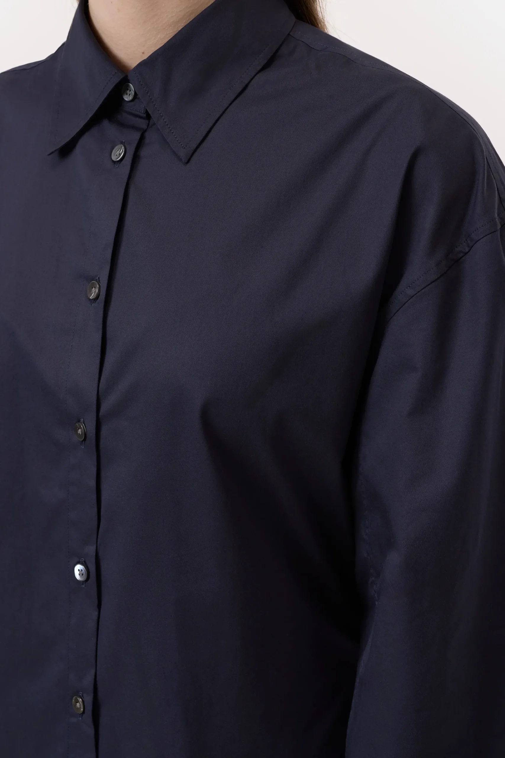Aus kräftiger Baumwoll-Popeline mit Paper-Touch-Griff: Unsere taillierte Bluse mit klassischem Hemdkragen, Perlmutt-K…