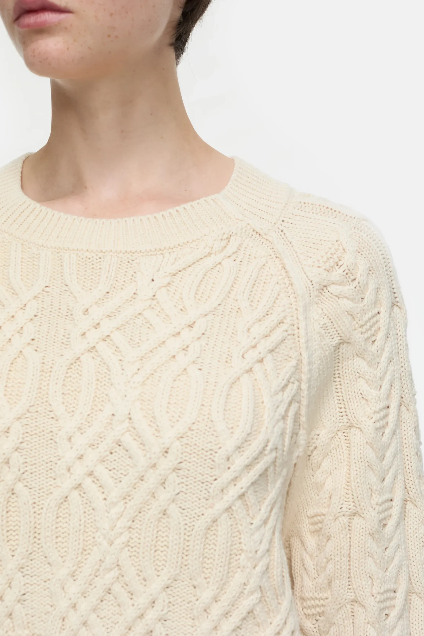 Ketten- und Zopfstrukturen im mittelschweren Strick (5 gg unterstreichen den sanft ausgewaschenen Farbton unseres Pull…