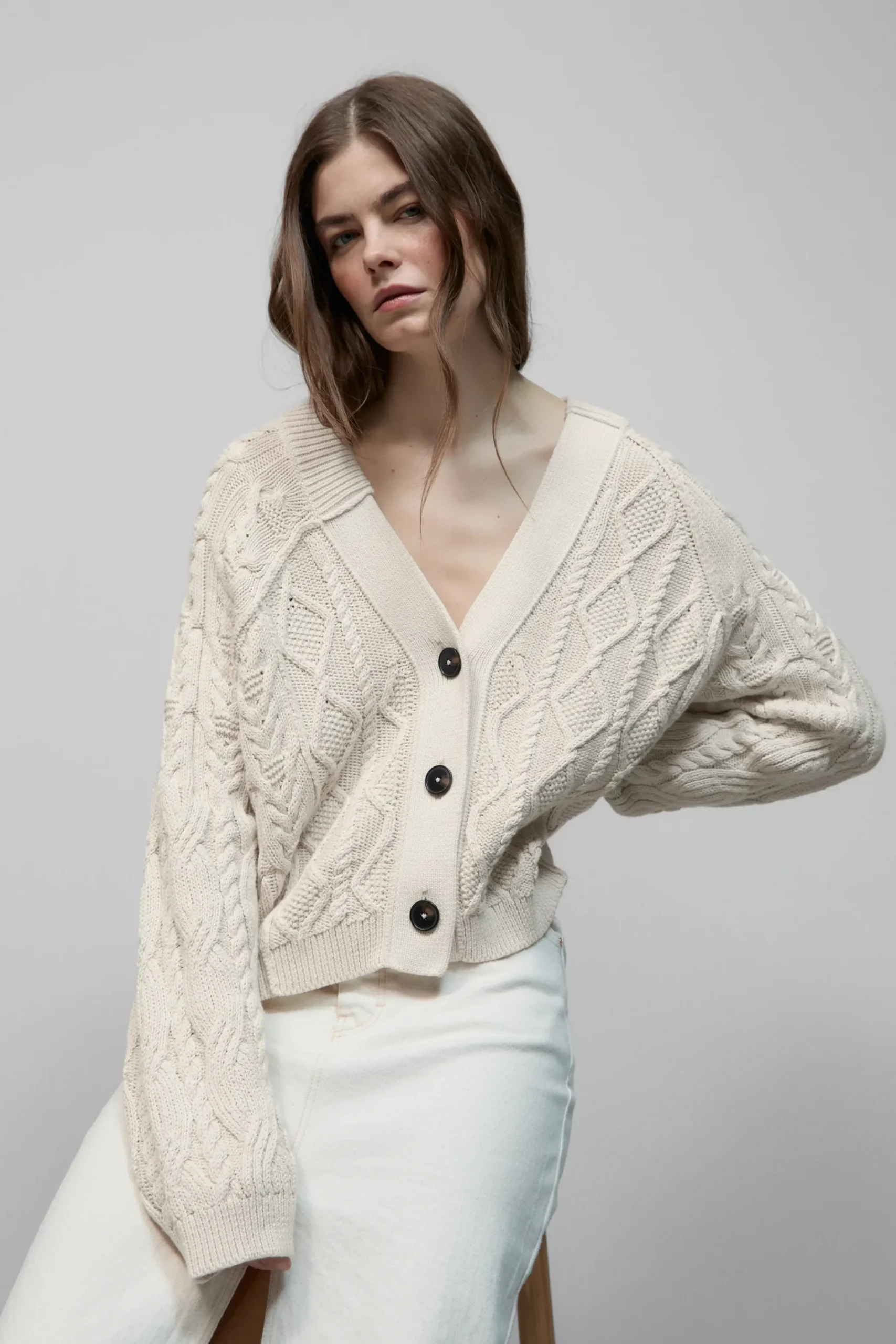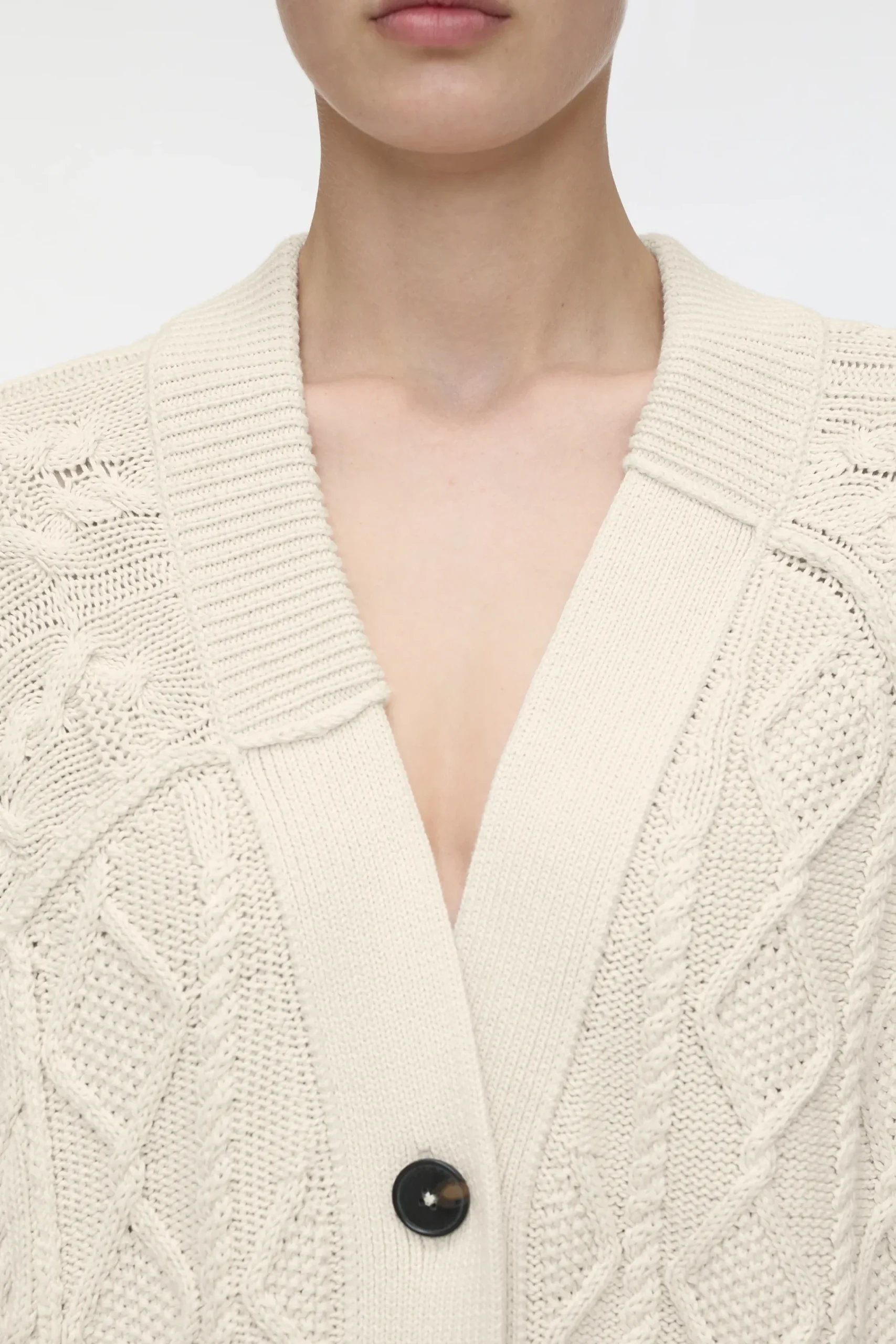 Der Cardigan mit Knöpfen in Horn-Optik ist aus reinem Bio-Baumwollgarn in unterschiedlichen Zopf- und Strick-Mustern …